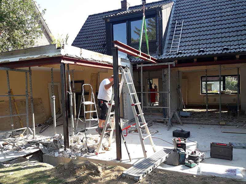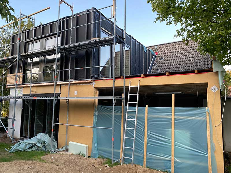 Der Bauherr hat ein Einfamilienhaus in Farmsen erworben, welches aus einem Erd- und Dachgeschoss bestand. Aufgrund beengter Platzverhältnisse wurde das Haus im durch einen Anbau erweitert.